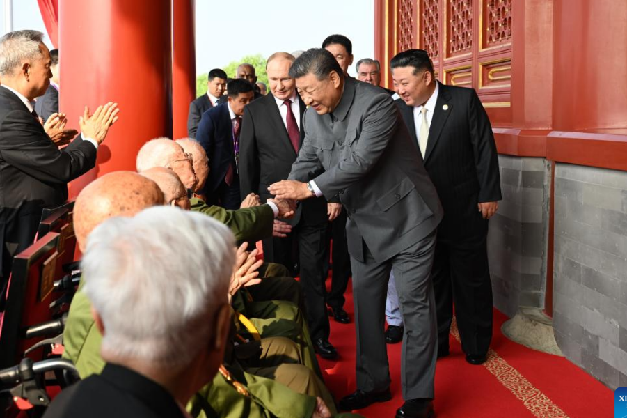 Председатель КНР Си Цзиньпин поднялся на трибуну Тяньаньмэнь и обменялся рукопожатиями с военными ветеранами, участвующими в торжественном собрании в честь Дня Победы.