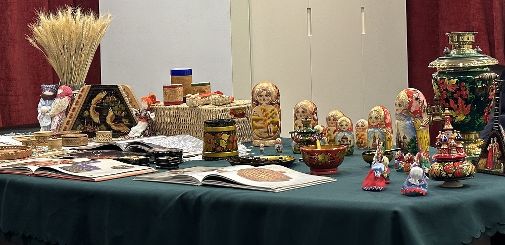 На мероприятии была представлена выставка изделий народных промыслов, которая привлекла большое внимание посетителей: дети и взрослые с интересом рассматривали расписные матрешки и шкатулки, посуду, украшенную хохломскими узорами, текстильные куклы-обереги и изделия из бересты.