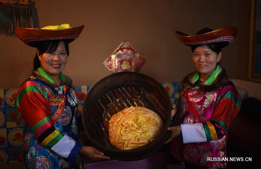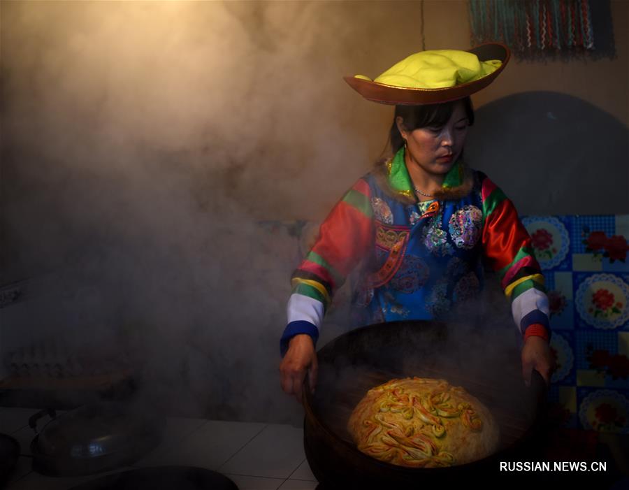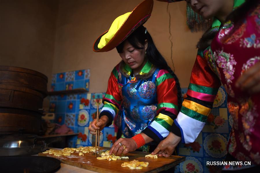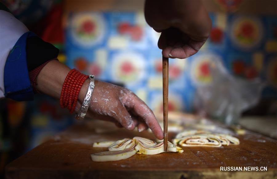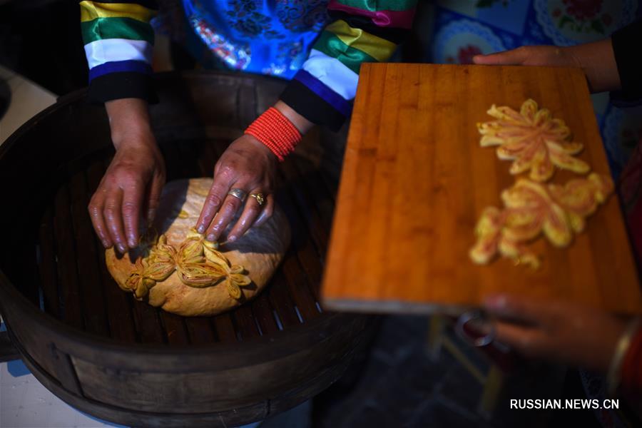 2 октября -- С приближением праздника Середины осени жители деревни Собутань поселка Даньма Хучжу-Туского автономного уезда городского округа Хайдун провинции Цинхай /Северо-Западный Китай/ начинают готовить традиционные праздничные кушанья народности ту. В туских семьях принято готовить на пару большие лунные пряники, которые по форме напоминают гигантские пампушки. В тесто добавляют софору лисохвостную, растительное масло и украшают заготовку лепными фигурками. (Синьхуа)