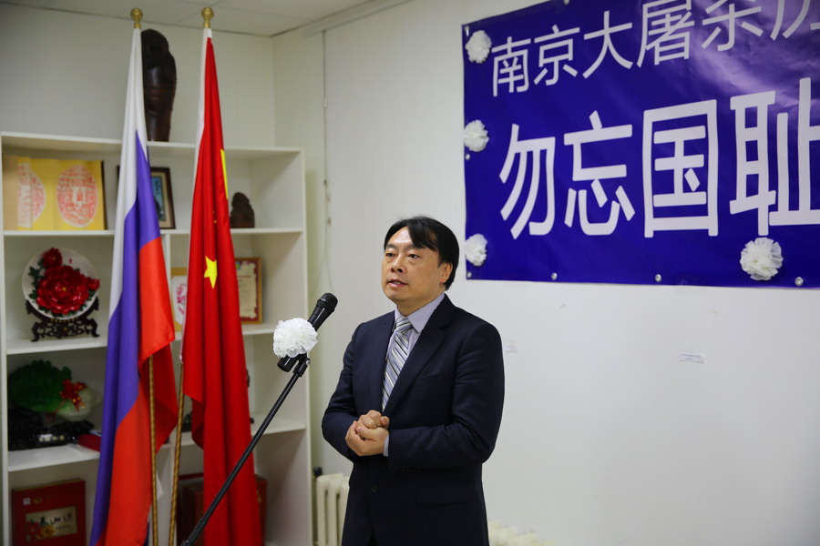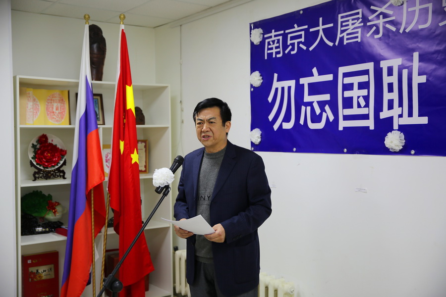 В первую очередь с траурной речью выступил председатель Московской ассоциации содействия распространению конфуцианской культуры Цзян Яньбинь. Он отметил, что, будучи представителями китайской нации, китайцы, живущие в Москве, принимают участие в данном мероприятии в День памяти жертв Нанкинской резни. Это не только наше желание, но и обязанность и долг. В своей речи он напомнил слова председателя КНР Си Цзиньпина, произнесенные в первый День памяти жертв Нанкинской резни, «забвение истории означает предательство, непризнание вины за злодеяния означает повторное преступление». Он призвал всех китайцев, живущих в России, крепко помнить историю и совместно защищать мир, доставшийся такой дорогой ценой.