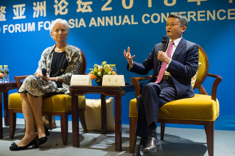 9 апреля на полях проходящего в поселке Боао провинции Хайнань /Южный Китай/ Боаоского азиатского форума 2018 года состоялся диалог между председателем совета директоров китайской компании Alibaba Group Ма Юнем /Джеком Ма/ и директором-распорядителем Международного валютного фонда /МВФ/ Кристин Лагард.