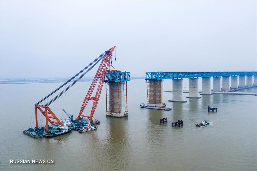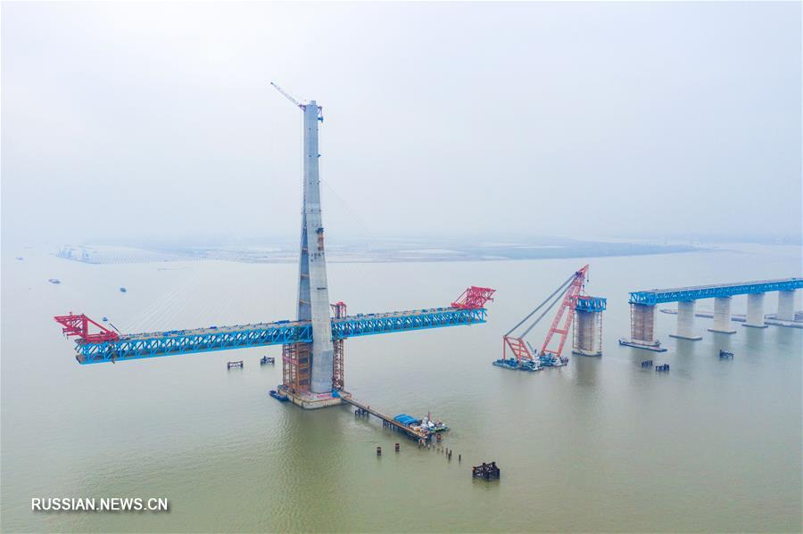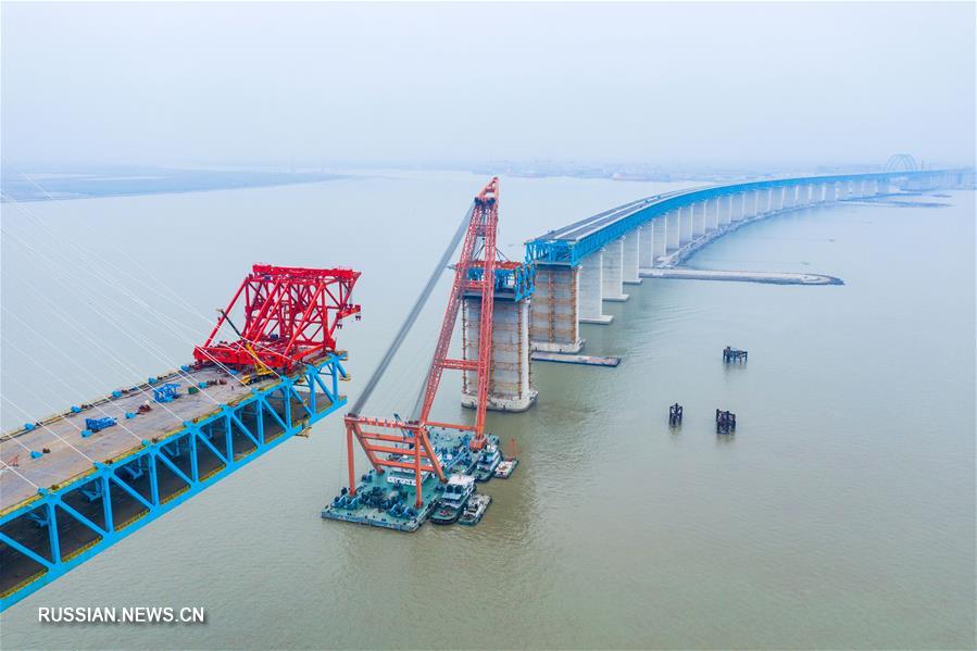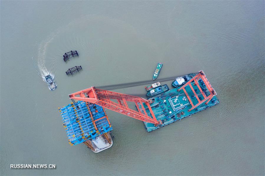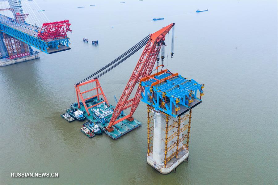 Строители установили последнюю стальную балку на опоры главной фарватерной секции моста Хутун