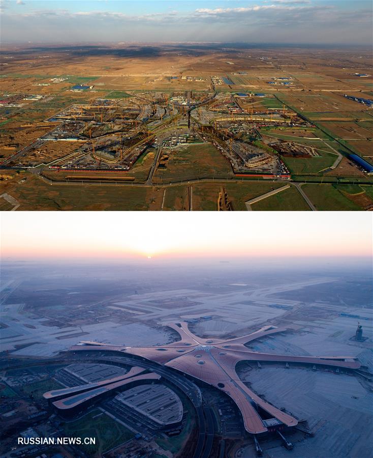 На фото сверху от 25 февраля 2017 года -- строительство нового пекинского аэропорта (Синьхуа);на фото снизу от 29 декабря 2018 года -- здание главного терминала пекинского международного аэропорта "Дасин" (Синьхуа)