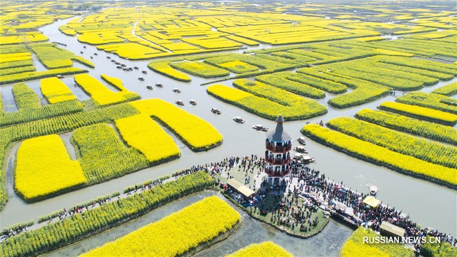 Золотые острова цветущего рапса в ландшафтном парке Цяньдо