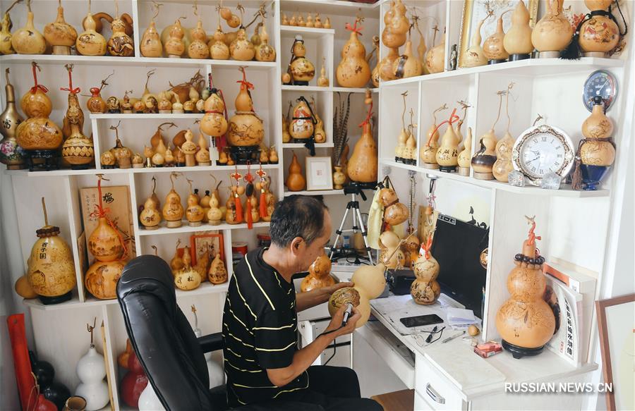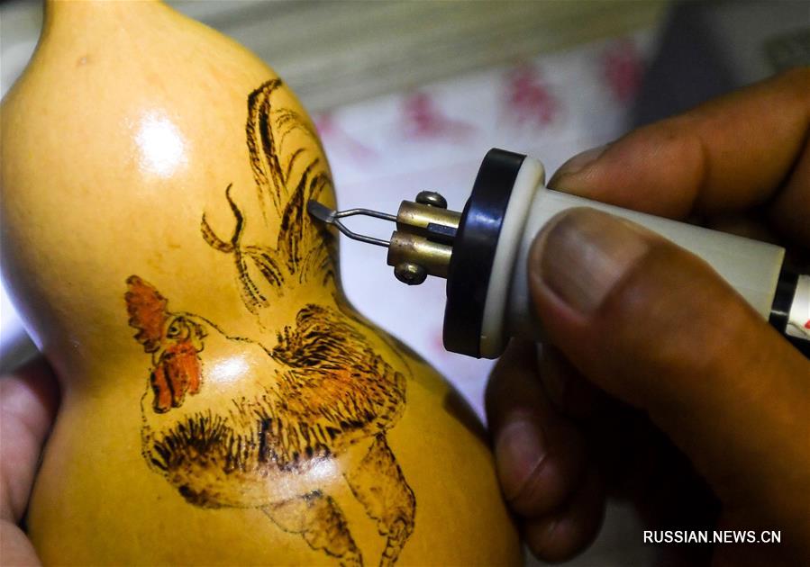 57-летний житель Чанчуня /провинция Цзилинь, Северо-Восточный Китай/ Ван Хунмяо самостоятельно освоил искусство выжигания по тыкве-горлянке и за 10 лет создал более 1000 произведений. Среди тем его работ -- цветы, птицы, рыбы и насекомые, исторические персонажи, мифические истории. ( Синьхуа)