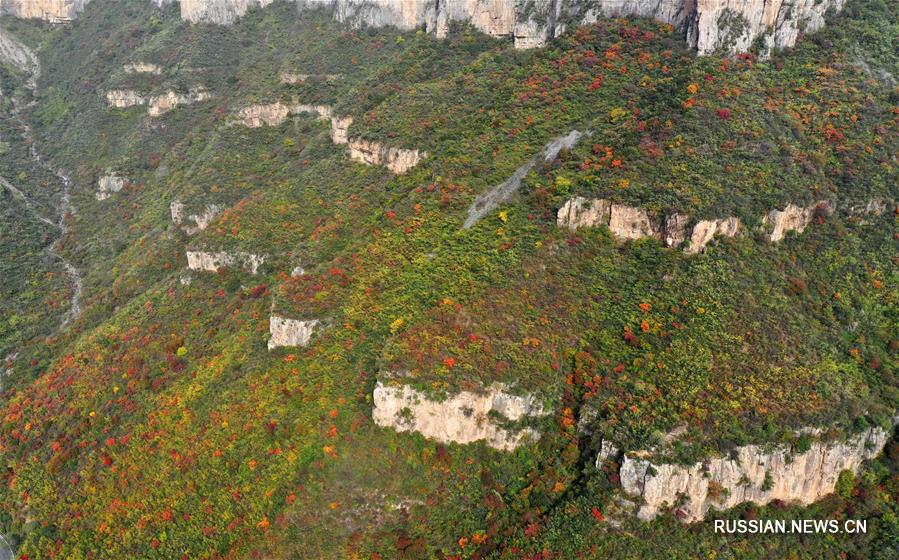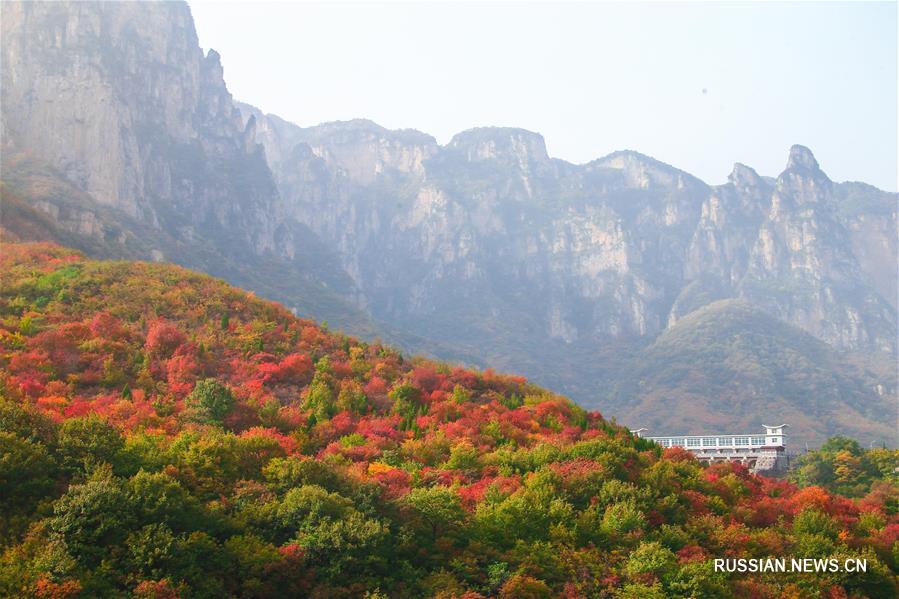 С приходом осенней прохлады склоны гор в ландшафтном парке Юньтайшань в горном массиве Тайханшань, на территории уезда Сюу /провинция Хэнань, Центральный Китай/, украсились багряными и золотыми листьями. (Синьхуа)