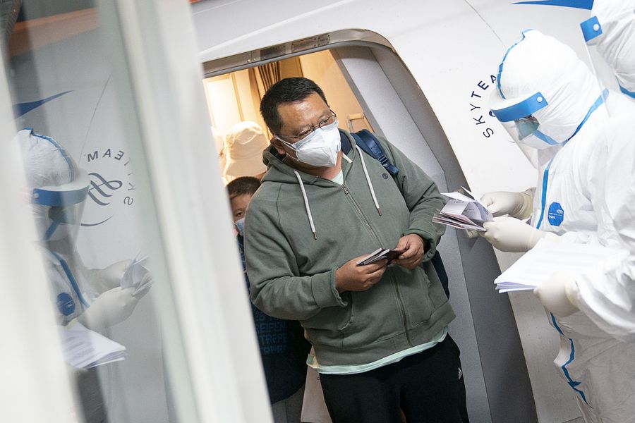 Медицинский персонал из провинции Гуандун /Южный Китай/ также поднялся на борт самолета, чтобы помочь с профилактическими противоэпидемическими мерами до и во время полета.