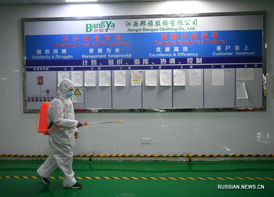 Предприятия в г. Наньчане пров. Цзянси постепенно возвращаются к нормальной работе. Чтобы обеспечить безопасность работников, на производстве принимаются меры противоэпидемической защиты: частая дезинфекция, раздельный прием пищи, регулярное измерение температуры тела. (Синьхуа)