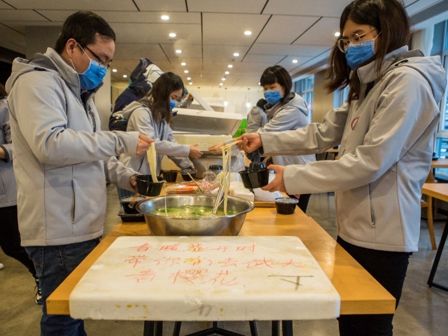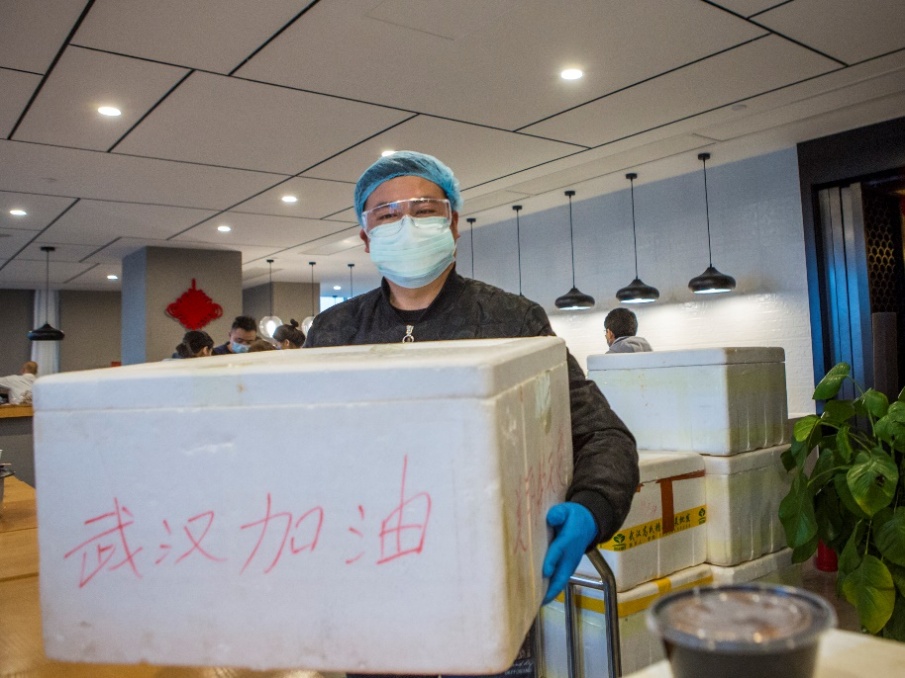 Сотрудники местной администрации преодолели проблемы, связанные с транспортировкой, и обеспечили медицинскую бригаду продуктам ипитания и напитками. Слова поддержки, написанные на пенопластовых ящиках, такие как «Держись, Ухань», трогают сердца работников медицинской бригады. (фото Ма Гэнпина)