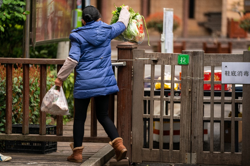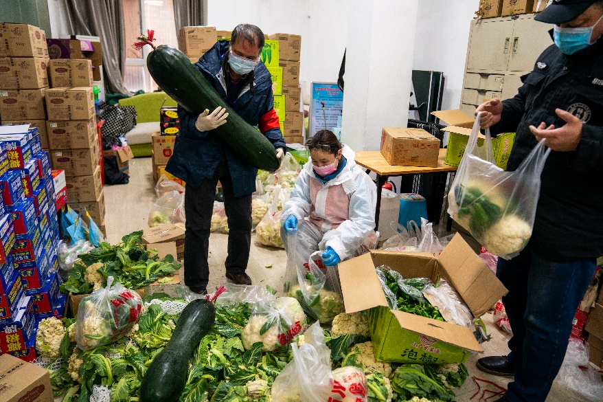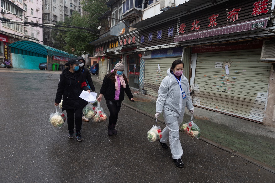 Жилищный комитет микрорайона «Уте» теперь похож на овощной магазин. Работники микрорайона раздают свежие овощи, доставленные в Ухань со всей страны, пожилым людям, не умеющим совершать покупки он-лайн, а также нуждающимся семьям.