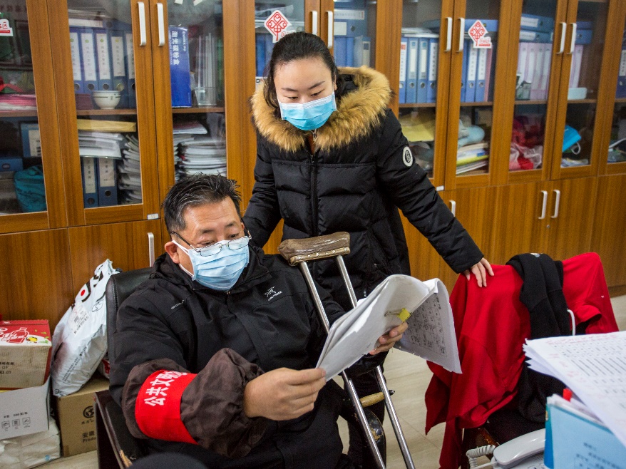 Се Чжиминь (слева) и Пань Цимин отвечают за дезинфекцию, а также регистрацию информации о людях, выходящих и входящих в закрытый на карантин микрорайон «Фанъинтай». Они являются членами КПК, работающими в Центре ремонта аварийных машин правоохранительных органов.