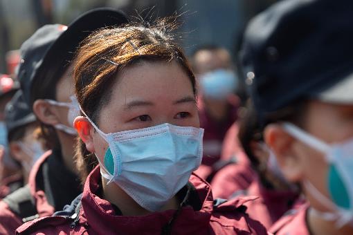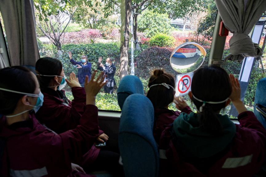 18 марта, медбригада из провинции Фуцзянь, состоящая из специального сестринского персонала, машет рукой на прощание.