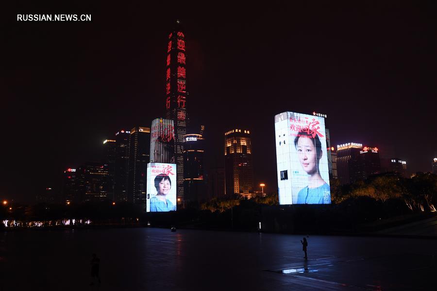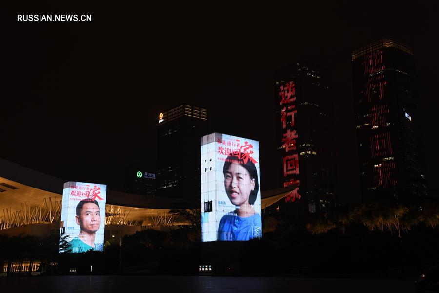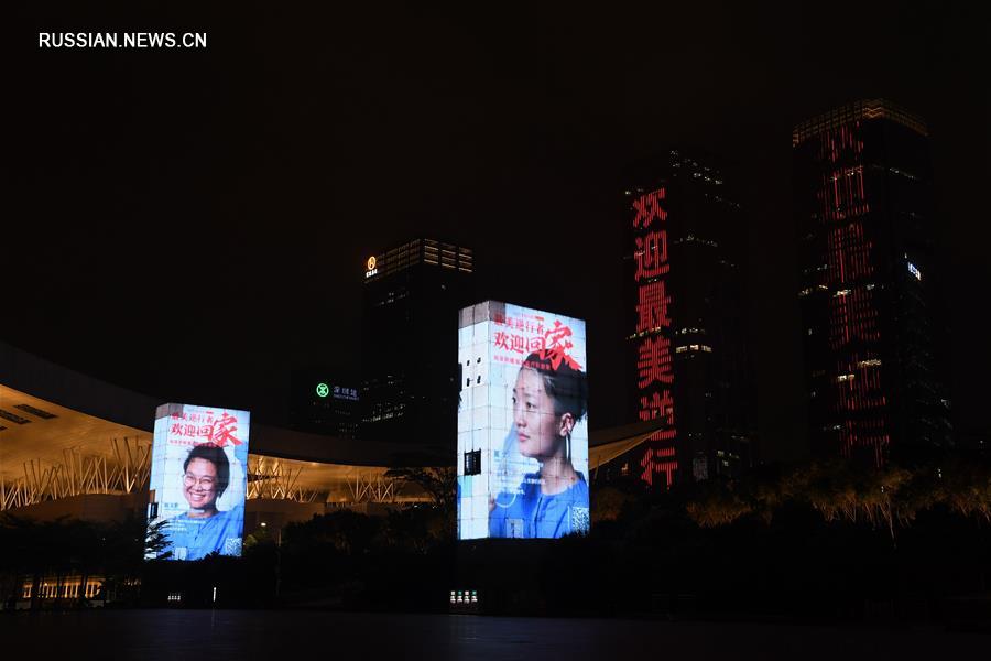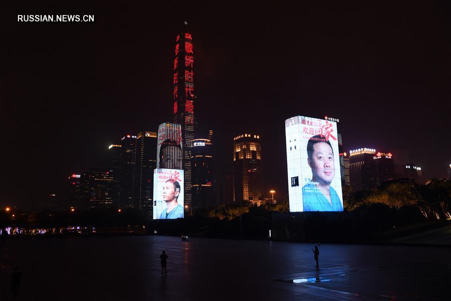 На фасадах важнейших зданий Шэньчжэня /провинция Гуандун, Южный Китай/ вечером 20 марта появились портреты героев -- членов медицинских бригад, участвовавших в борьбе с эпидемией в провинции Хубэй. (Синьхуа)