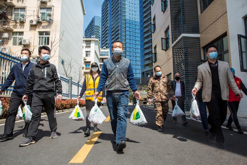 20 марта, председатель логистической компании «Цзюйли Динсин» Фэн Чуаньли (четвертой слева) доставляет рыбу со служащими компании и волонтерами микрорайона.