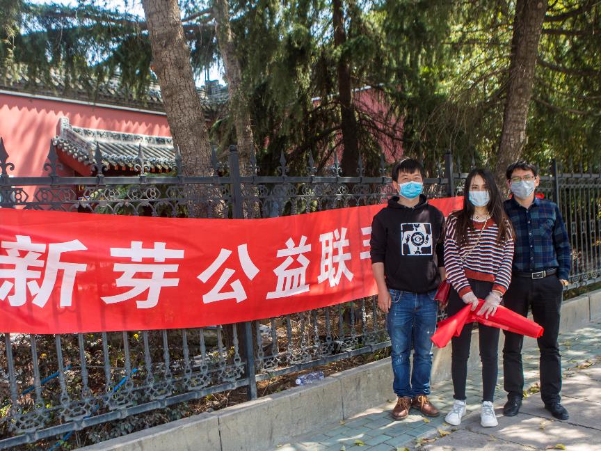 Волонтер Хуан Вэй (первый слева), члены организации «Синья» Ся Сянпин (вторая слева) и Лю Минчжун (третий слева).