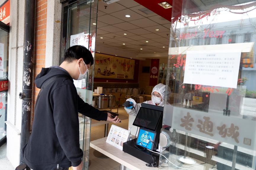3 апреля, филиал ресторана «Лаотунчэн», расположенный на улице Цзицин г. Ухань, снова работает после двухмесячного перерыва. Житель города Ухань покупает себе завтрак в ресторане.