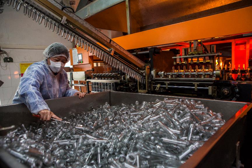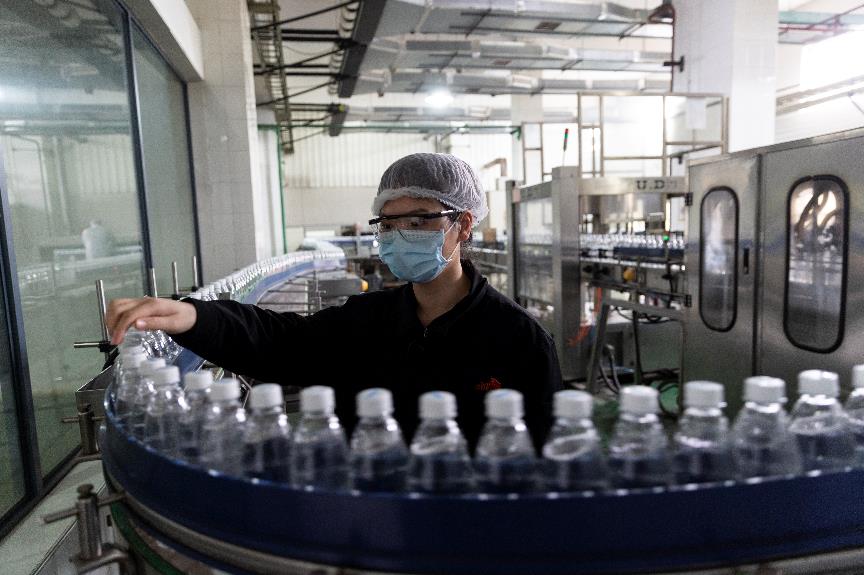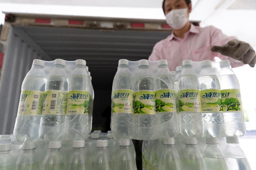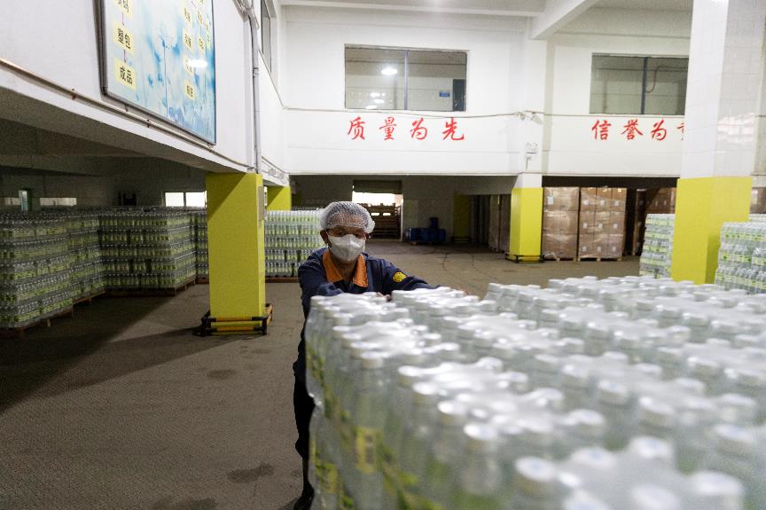 На складе завода безалкогольных напитков компании «Хаошэнхо» упаковки с напитками аккуратно сложены штабелями. С 18 марта завод постепенно возобновил производство, обеспечив производственную мощность 180 тыс. бутылок в сутки.