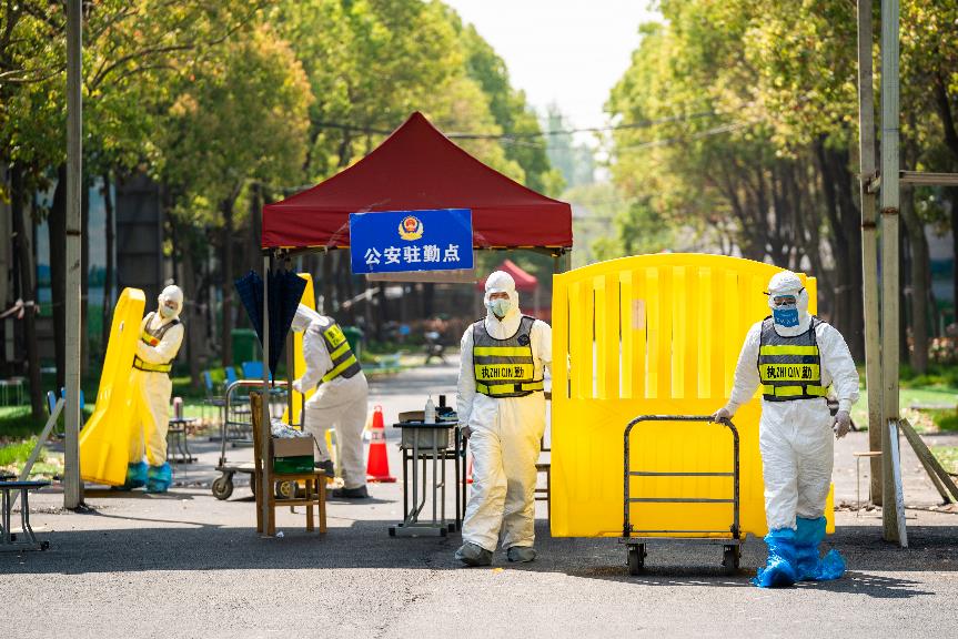 Утро 13 апреля, центр реабилитации «Чанцзян Синьчэн» г. Ухань. Дежурные охранники убирают дорожное заграждение.