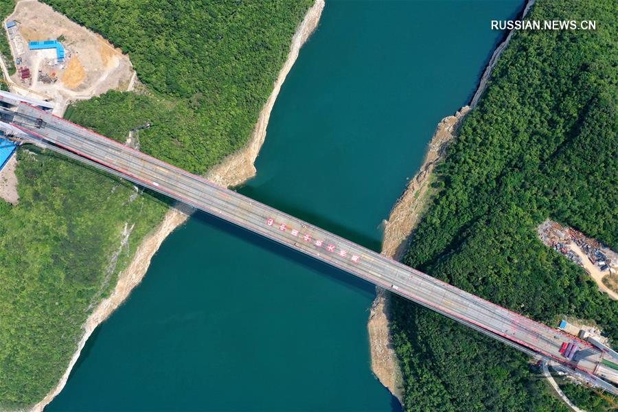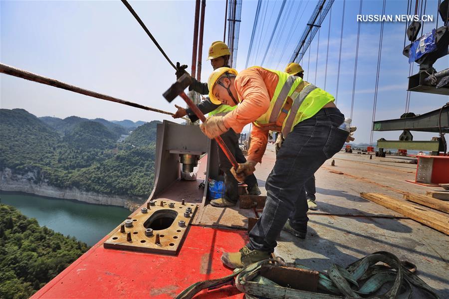 29 апреля строители компании China Railway Major Bridge Engineering Group произвели смычку Фэйлунху-Уцзянского большого моста на скоростном шоссе Цзуньи – Юйцин в провинции Гуйчжоу (Юго-Западный Китай). (Синьхуа)
