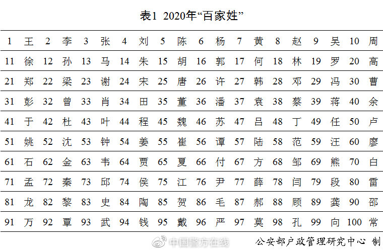 Министерство общественной безопасности Китая опубликовало «Отчет о национальных именах в 2020 году». «Ван», «Ли», «Чжан», «Лю» и «Чэнь» по-прежнему входят в первую пятерку самых распространенных фамилий, их носят 30,8% населения. В 2020 году было зарегистрировано 10,035 млн новорожденных, из них 5,290 млн мальчиков, что составляет 52,7%, и 4,745 млн девочек, что составляет 47,3%. В прошлом году фамилия «Ли» стала самой популярной, количество новых зарегистрированных младенцев с этой фамилией составило 726 тыс., меньше всего новорожденных получили фамилию «Гу» – всего 17 тыс. Согласно статистики, соотношение фамилий матери и отца составляет 1:12.