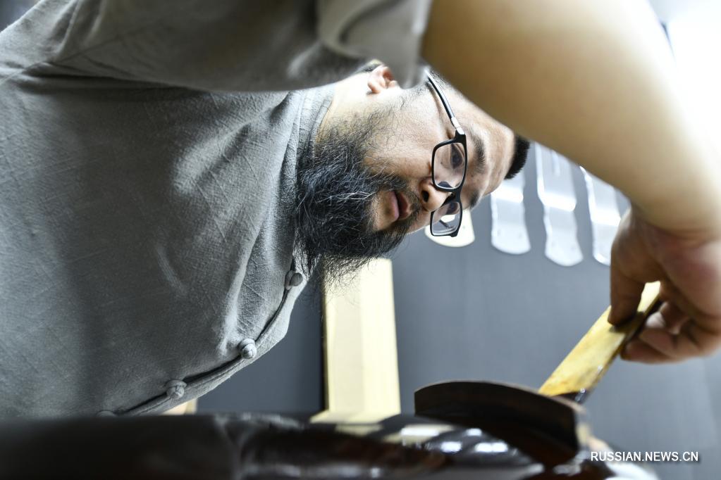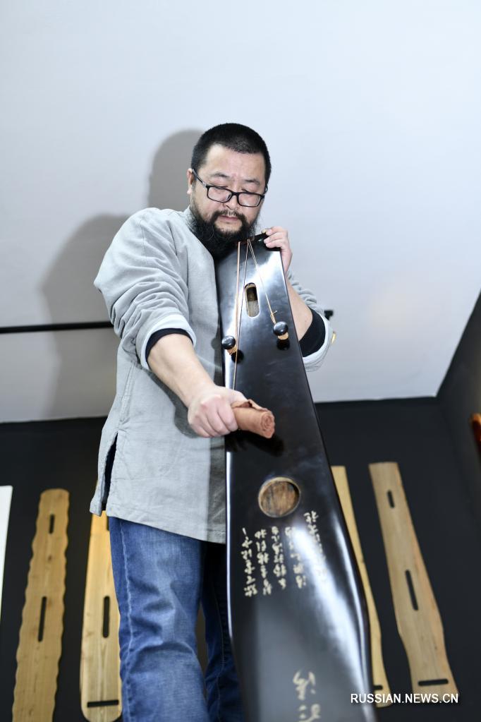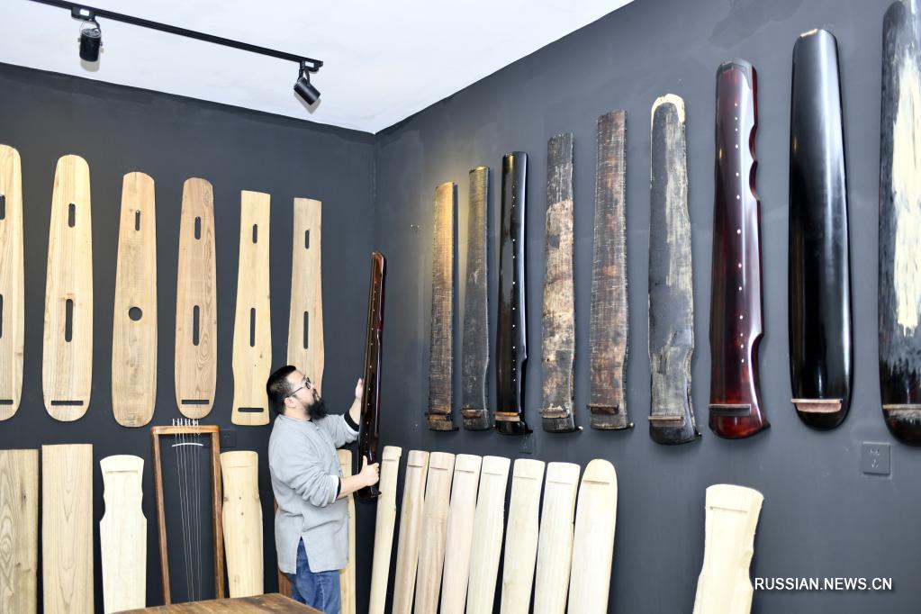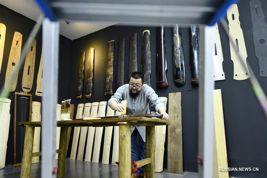 На фото -- Ван Бин, репрезентативный хранитель нематериального культурного наследия городского округа Цзуньи /провинция Гуйжоу, Юго-Западный Китай/, изготавливает гуцинь в своей мастерской.