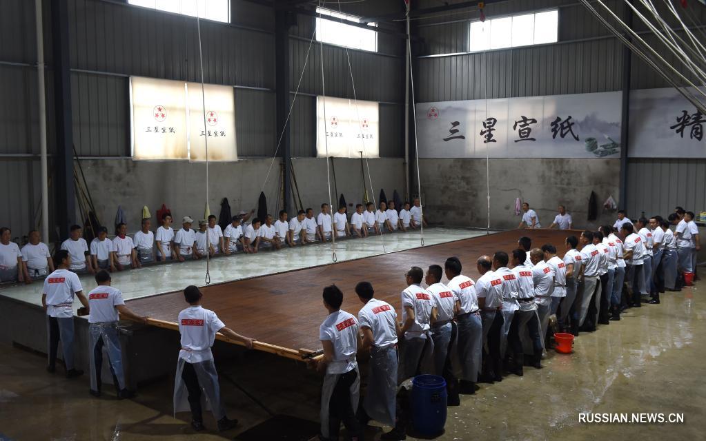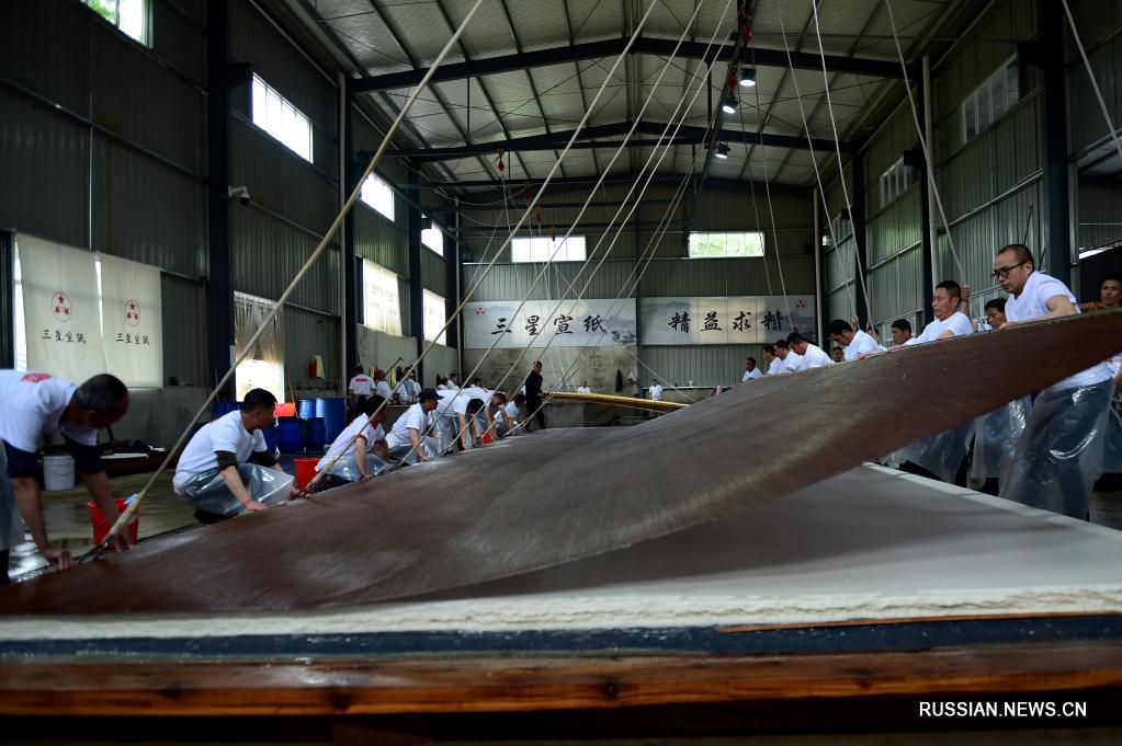 На родине бумаги сюаньчжи, в уезде Цзинсянь городского округа Сюаньчэн провинции Аньхой /Восточный Китай/, на днях начался процесс изготовления "четырехчжановой сюаньчжи" /1 чжан равен примерно 3,3 м/ на одной из бумажных фабрик. В процессе производства более 50 рабочих выверенными и согласованными движениями два раза окунают огромную бамбуковую сетку в бассейн с раствором, чтобы на ней осели частицы бумажной массы, а затем поднимают на веревках и уносят в сторону с образовавшимся сверху тонким слоем бумаги. После сушки и обрезки получаются листы длиной 13,2 м и шириной 3,6 м.