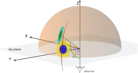 Схема трехмерной оси вращения и вектора скорости пульсара J0538 + 2817 на поверхности единичной сферы. /Фото предоставлено Национальной астрономической обсерваторией/