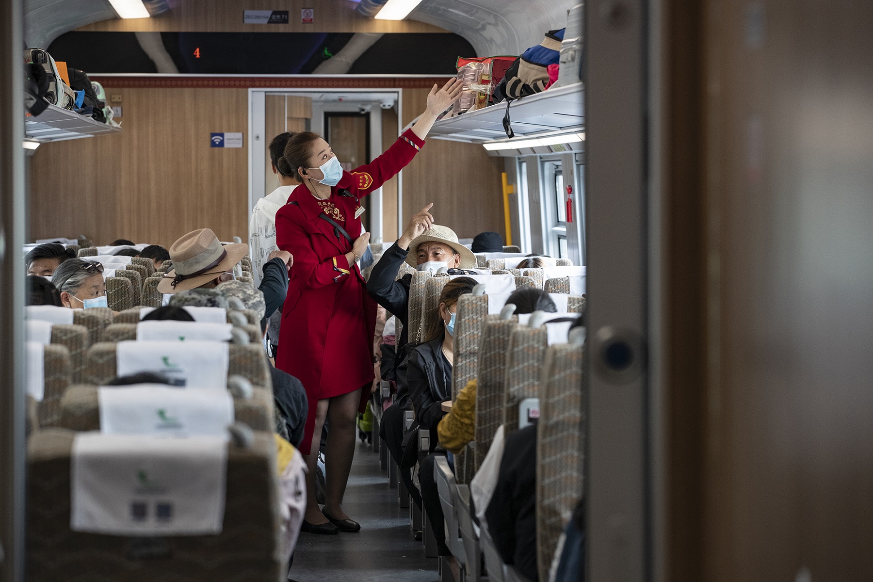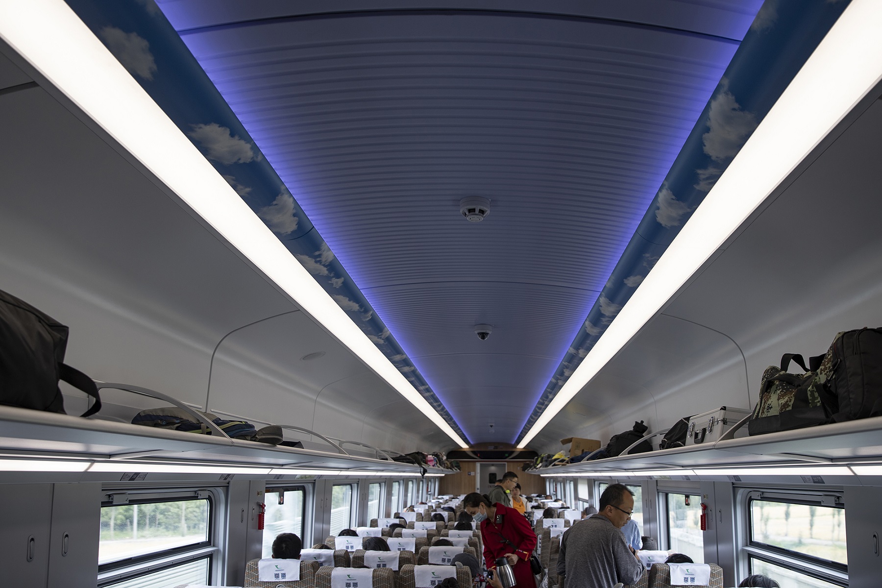 Верхняя часть вагона оснащена синей подсветкой, обозначающей отличительный цвет Цинхай-Тибетского нагорья.