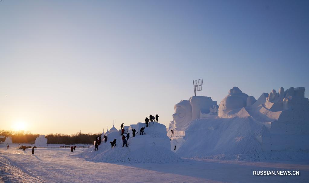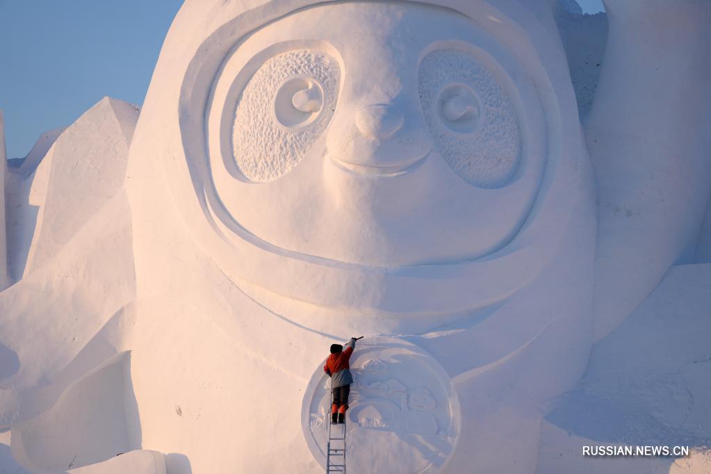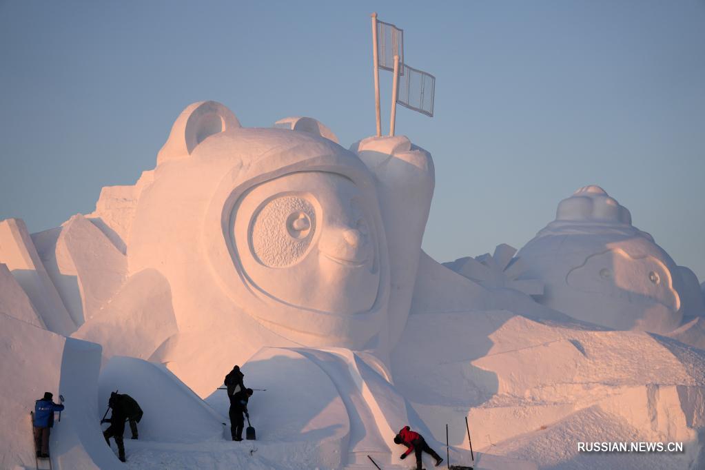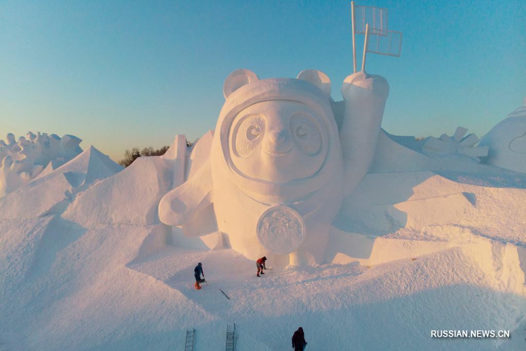 Снежные скульптуры на тему зимних Олимпийских игр представлены в Харбине