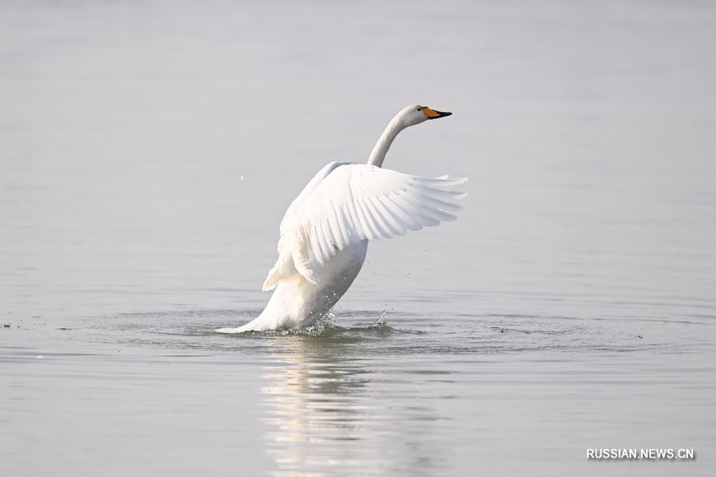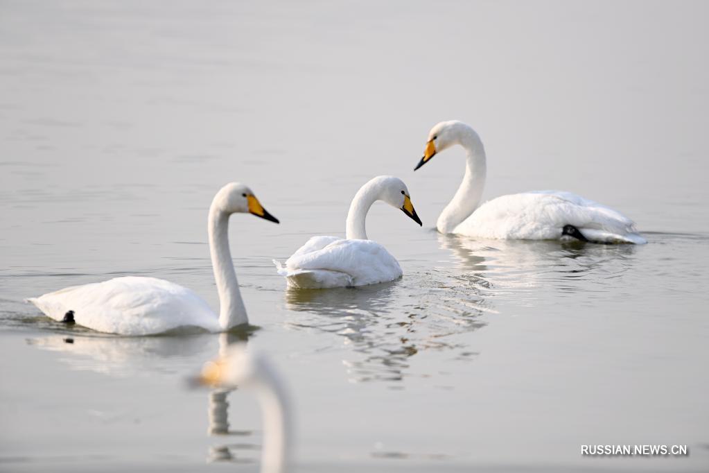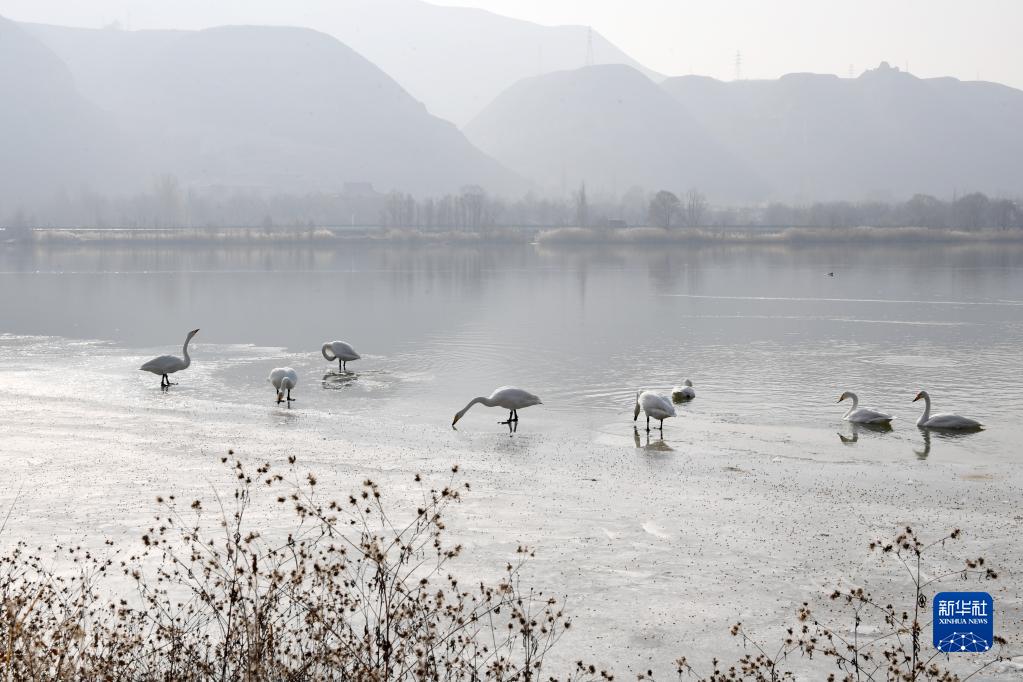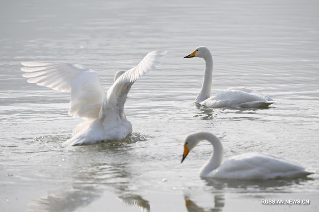 Стая белых лебедей на днях прилетела на зимовку в поселок Дачуань города Ланьчжоу /провинция Ганьсу, Северо-Западный Китай/, где река Хуаншуй впадает в реку Хуанхэ, вторую по протяженности реку в стране.