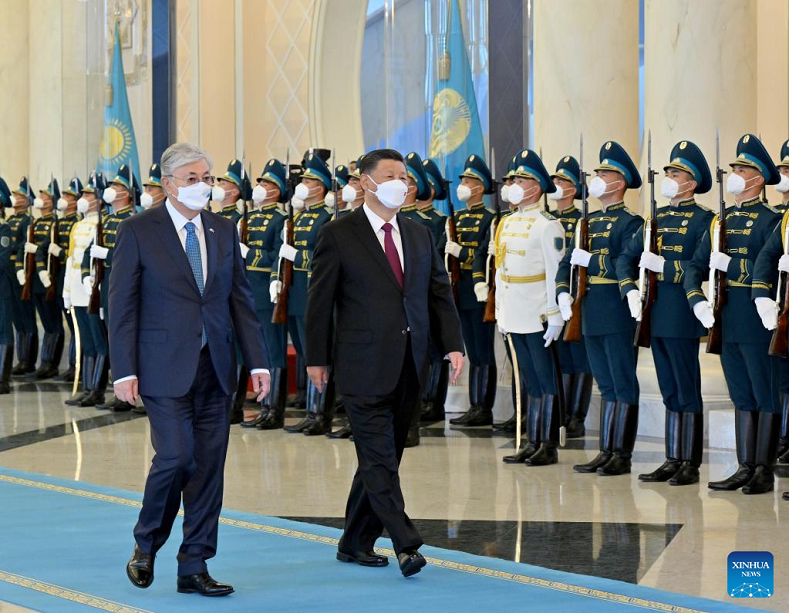 К.-Ж. Токаев в своей резиденции провел торжественную церемонию приветствия председателя Си Цзиньпина. Главы двух государств вместе поднялись на почетную трибуну, и военный оркестр сыграл государственные гимны Китая и Казахстана. Си Цзиньпин в сопровождении К.-Ж. Токаева осмотрел почетный караул.