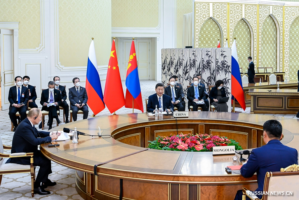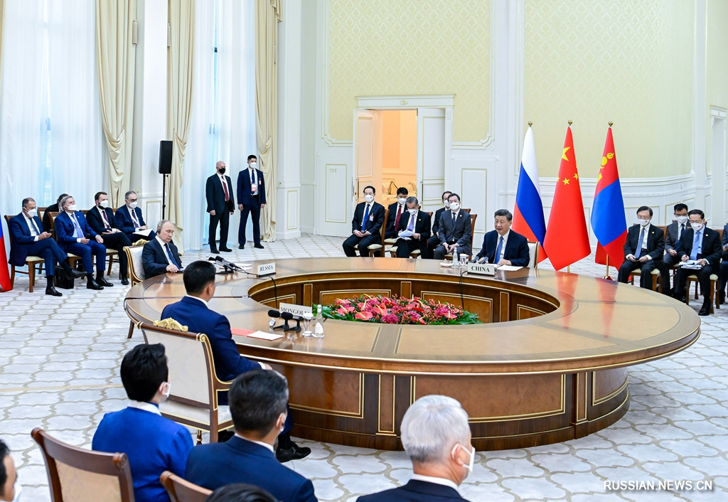 Председатель КНР Си Цзиньпин, президент России Владимир Путин и президент Монголии Ухнаагийн Хурэлсух провели 6-ю встречу лидеров трех государств в четверг во второй половине дня в Самарканде.