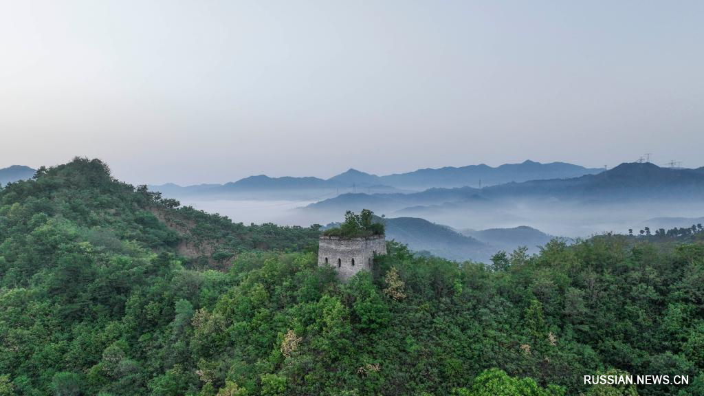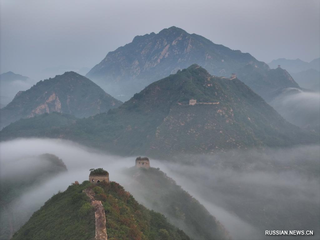 Ранним утром солнце, показавшееся из-за облаков после дождя, осветило утопавший в тумане участок Великой китайской стены в городе Таншань /пров. Хэбэй, Северный Китай/, сформировав живописный пейзаж.