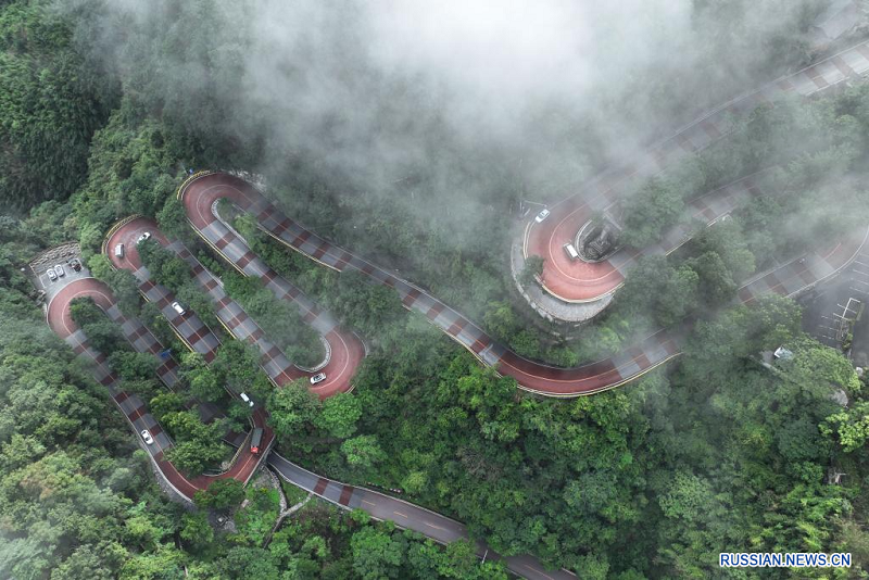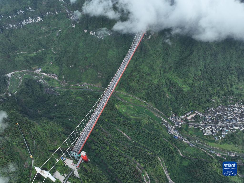 На снимке запечатлен живописный вид на подвесной автодорожный мост Айчжай на территории города Цзишоу Сянси-Туцзя-Мяоского автономного округа провинции Хунань /Центральный Китай/.