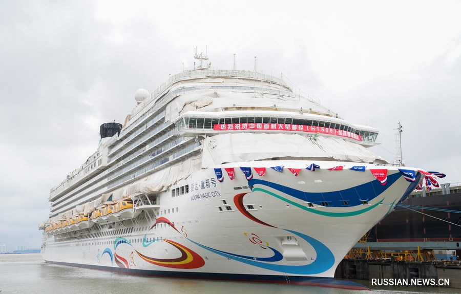 Первый построенный в Китае большой круизный лайнер Adora Magic City в понедельник отправился из порта Шанхая в пробный рейс.