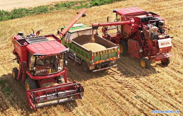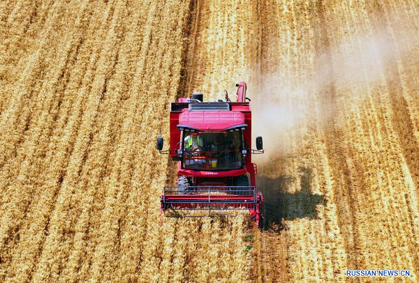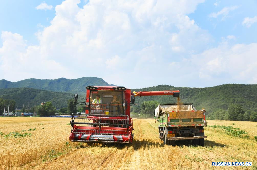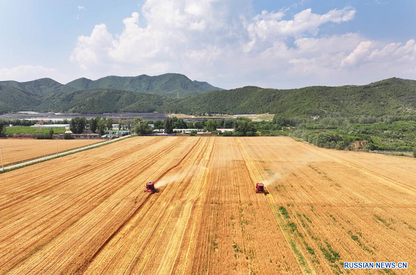 В настоящее время в районе Пингу в Пекине идет интенсивная уборка летнего урожая пшеницы. Как стало известно, в этом году посевная площадь этого злака в районе составляет более 30 тыс. му, а общий объем урожая, как ожидается, превысит 10 тыс. тонн. /Фото: Синьхуа/