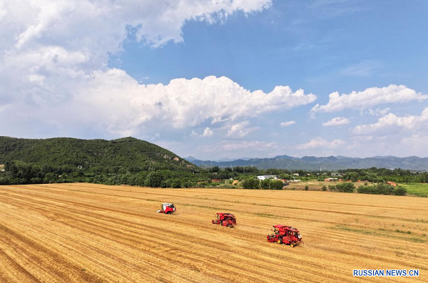 Уборка летнего урожая пшеницы в районе Пингу в Пекине
