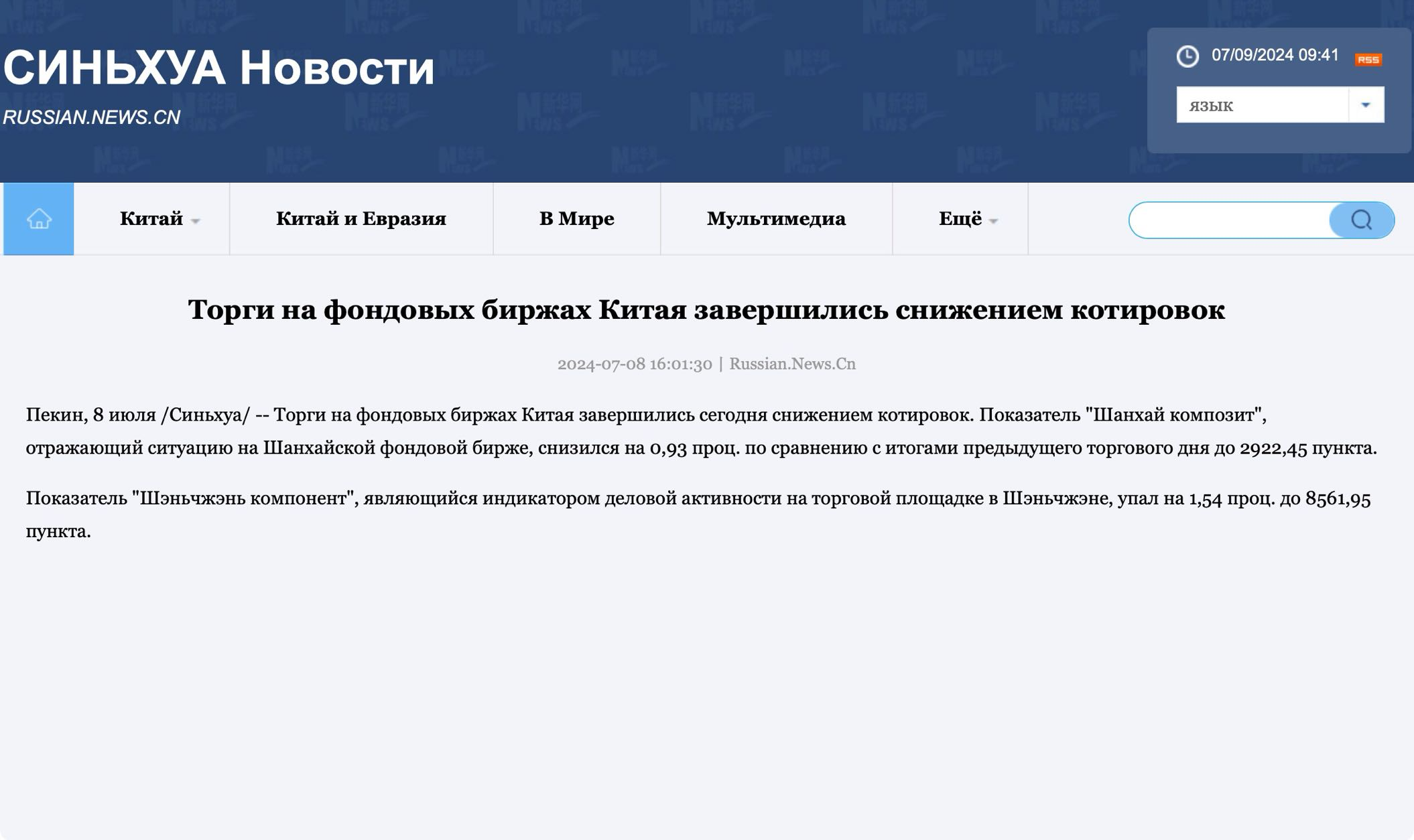 Торги на фондовых биржах Китая завершились сегодня снижением котировок. Показатель "Шанхай композит", отражающий ситуацию на Шанхайской фондовой бирже, снизился на 0,93 проц. по сравнению с итогами предыдущего торгового дня до 2922,45 пункта.