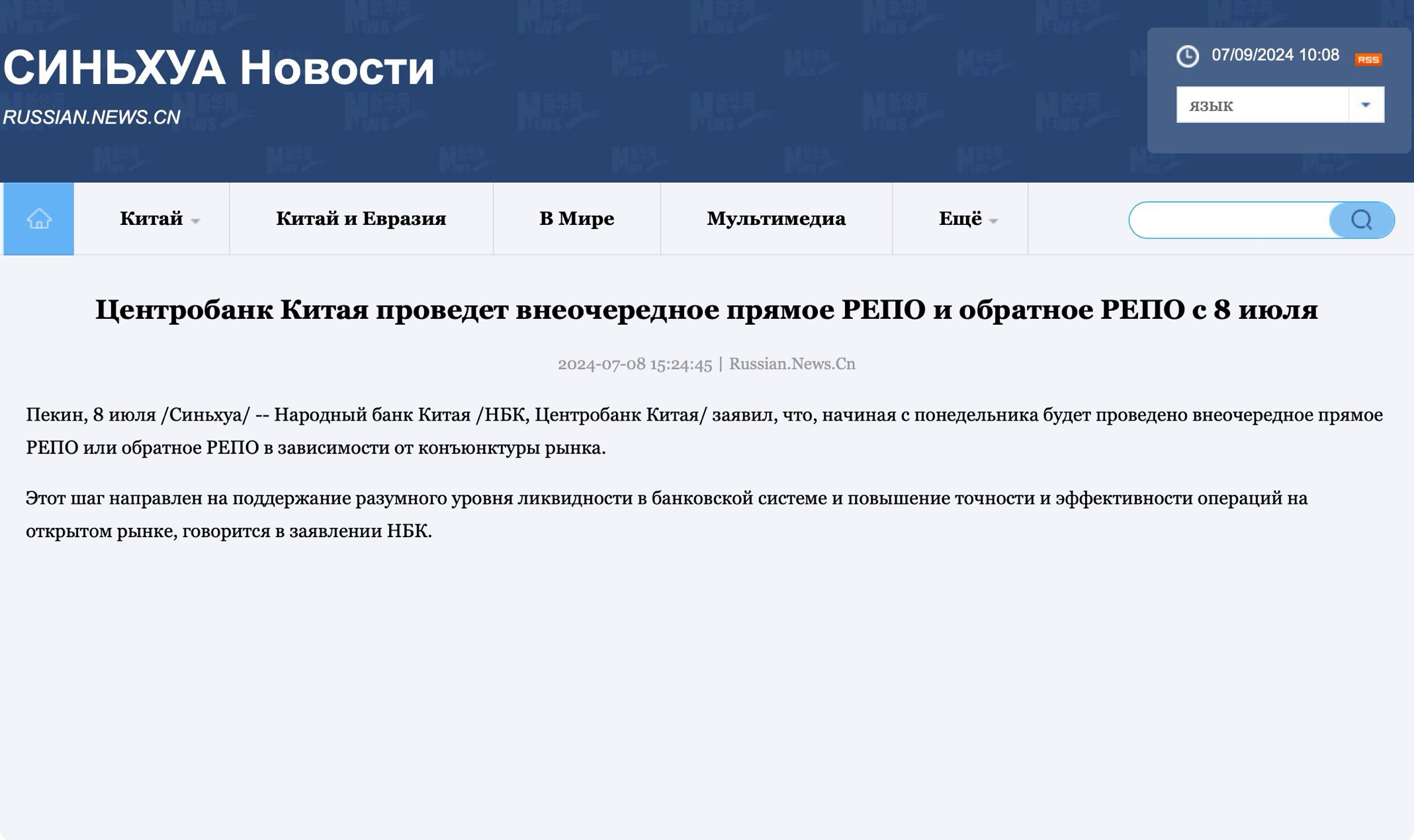 Центробанк Китая проведет внеочередное прямое РЕПО и обратное РЕПО с 8 июля