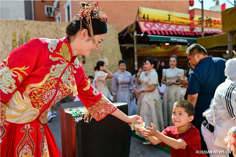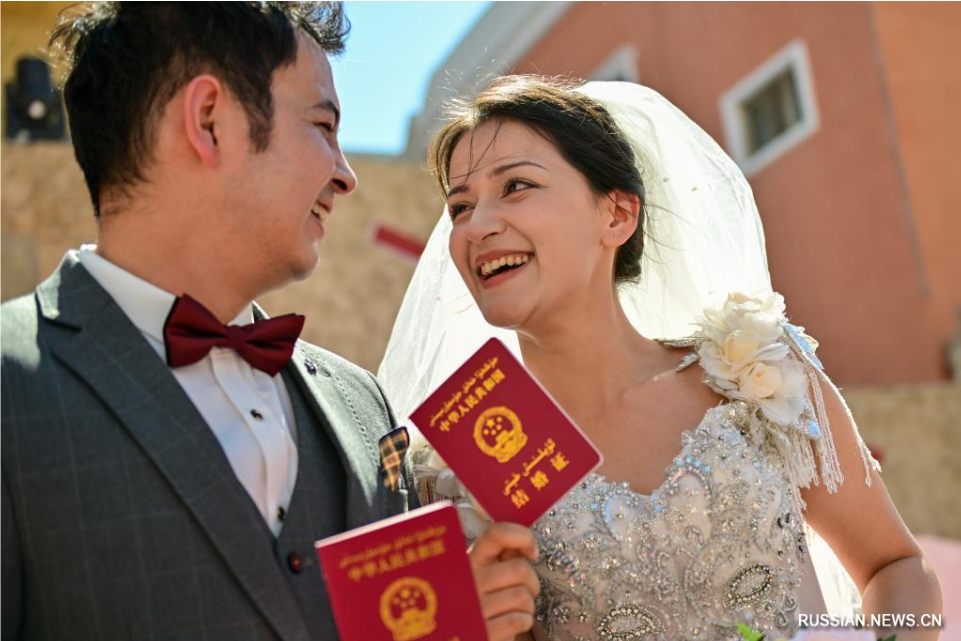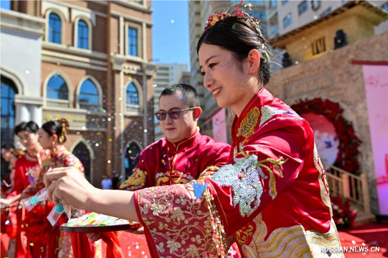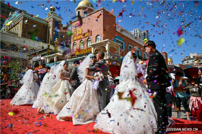 Во время этого романтического праздника в городе Урумчи Синьцзян-Уйгурского автономного района на северо-западе Китая состоялась коллективная свадебная церемония с участием 10 пар /Фото: Синьхуа/