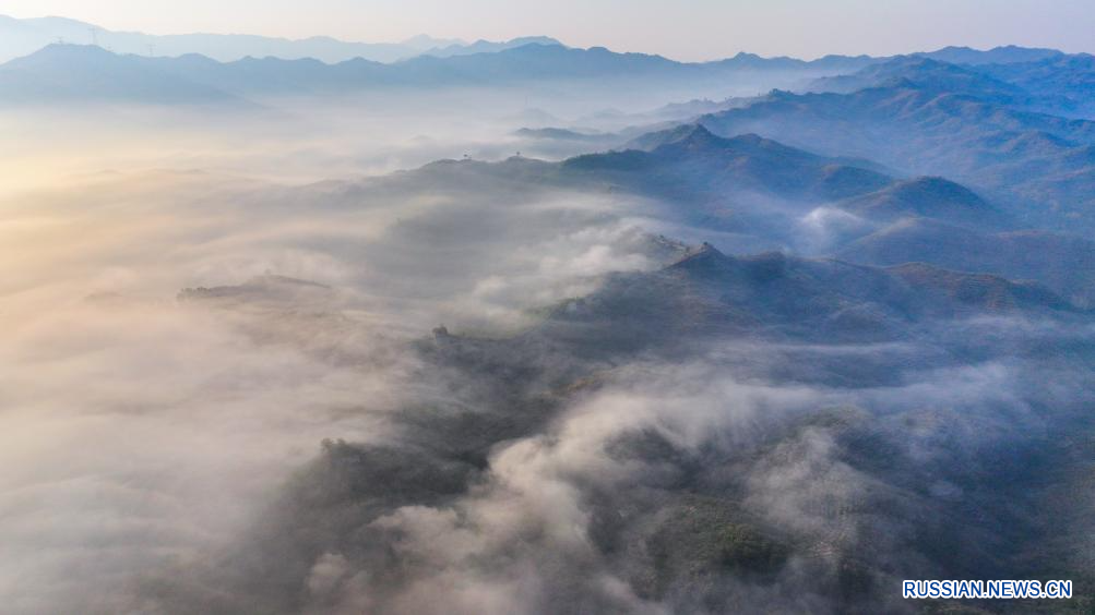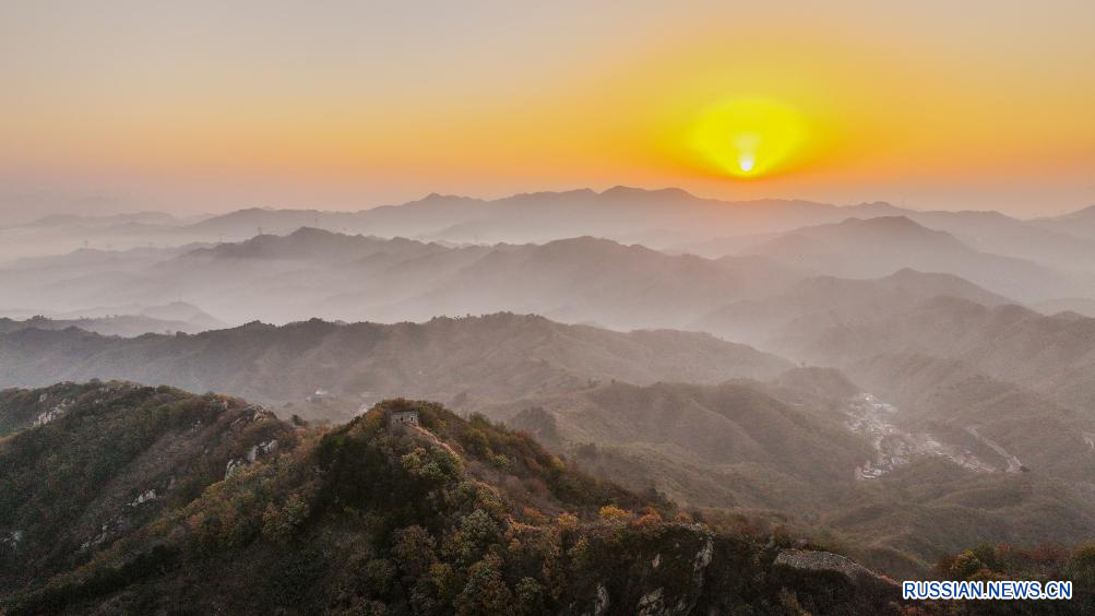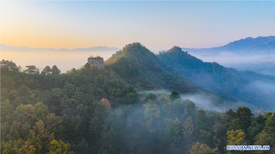 На снимке запечатлен осенний пейзаж на участке Великой Китайской стены на территории города Цзуньхуа провинции Хэбэй на севере Китая.