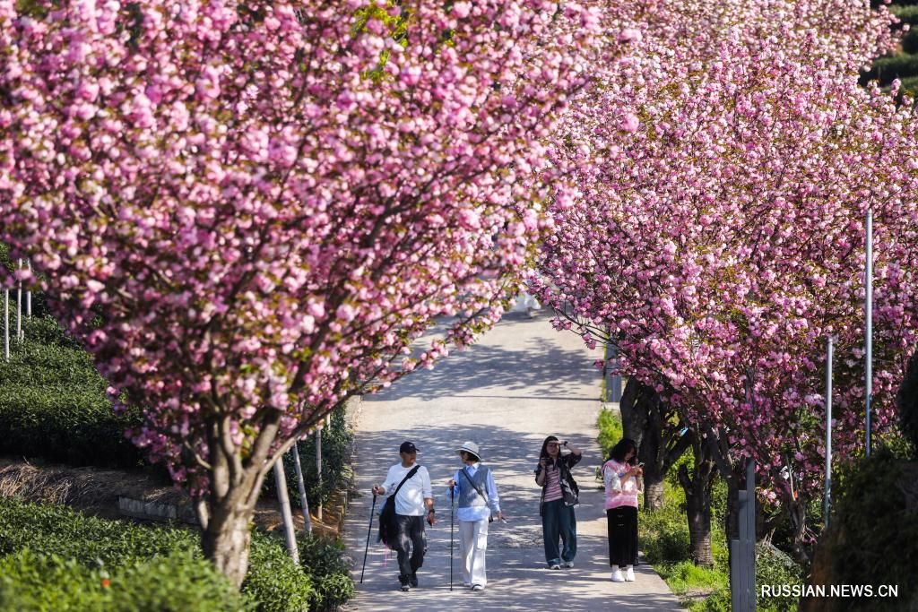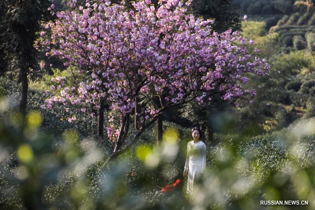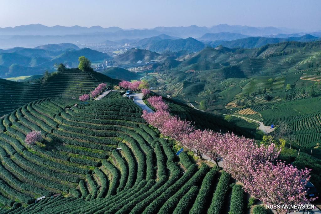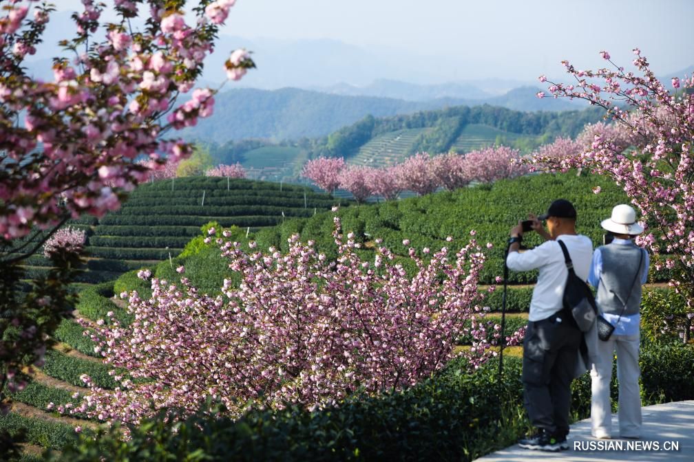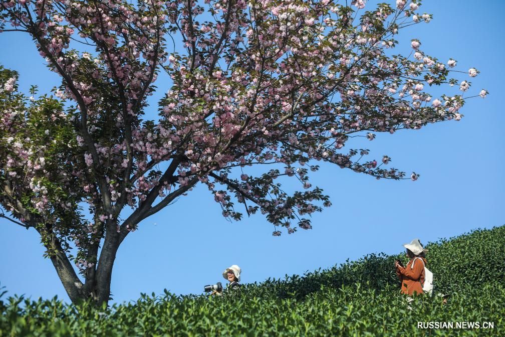 В районе Фуян города Ханчжоу провинции Чжэцзян /Восточный Китай/ расцвела сакура, рассеянная на чайной плантации, привлекая множество туристов прелестными весенними пейзажами.