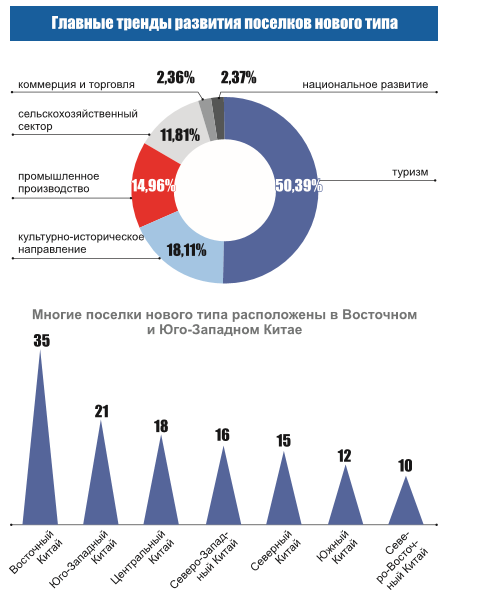 В период 12-й пятилетки (2011-2015) провинция Гуйчжоу намерена создать 100 таких образцовых поселков. Концепция их строительства максимально учитывает местную специфику и предполагает экологическое, чистое развитие. Провинция Чжэцзян следом за Гуйчжоу также активно создает новые поселки с целью модернизации промышленности. В настоящее время в Китае насчитывается 20 тыс. поселков городского типа, которые уже развиваются с учетом ?новой урбанизации?. Глава ученого совета Центра развития и реформы городов и поселков Фэн Куй отметил, что стержнем развития таких поселков должно быть отношение самих людей к своей "малой родине". "Поселки с местной спецификой должны иметь не только свои отличительные отрасли, но заряжены активным настроем людей, местной общественности. Гармонизировать две составляющие развития, социальную и экономическую, очень важно".