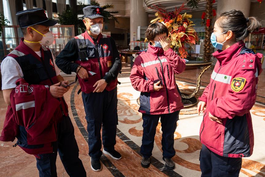 Лю Ли (вторая справа, медик отделения экстренной медицинской помощи Народной больницы г. Ганьсу) прощается с Фэн Чжихуэем (второй слева, медик Национальной группы по оказанию первой медицинской помощи провинции Сычуань) в фойе отеля.