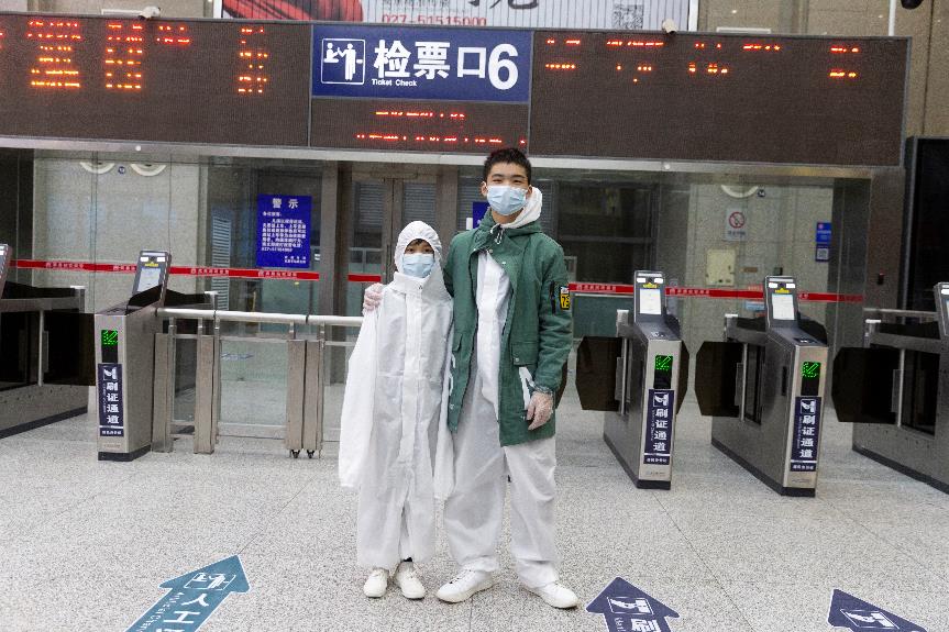 Школьник 9-го класса Лю Цижуй (слева) и его младшая сестра Лю Ваньсинь (ученица 3-го класса). Перед Китайским Новым годом они вместе с мамой приехали из г. Гуанчжоу в г. Ухань в гости к своему дяде. «Наконец-то я смогу увидеть папу, бабушку и дедушку. Папа по нам очень соскучился, каждый день выходит с нами на видео-связь», – сказала Лю Ваньсинь.
