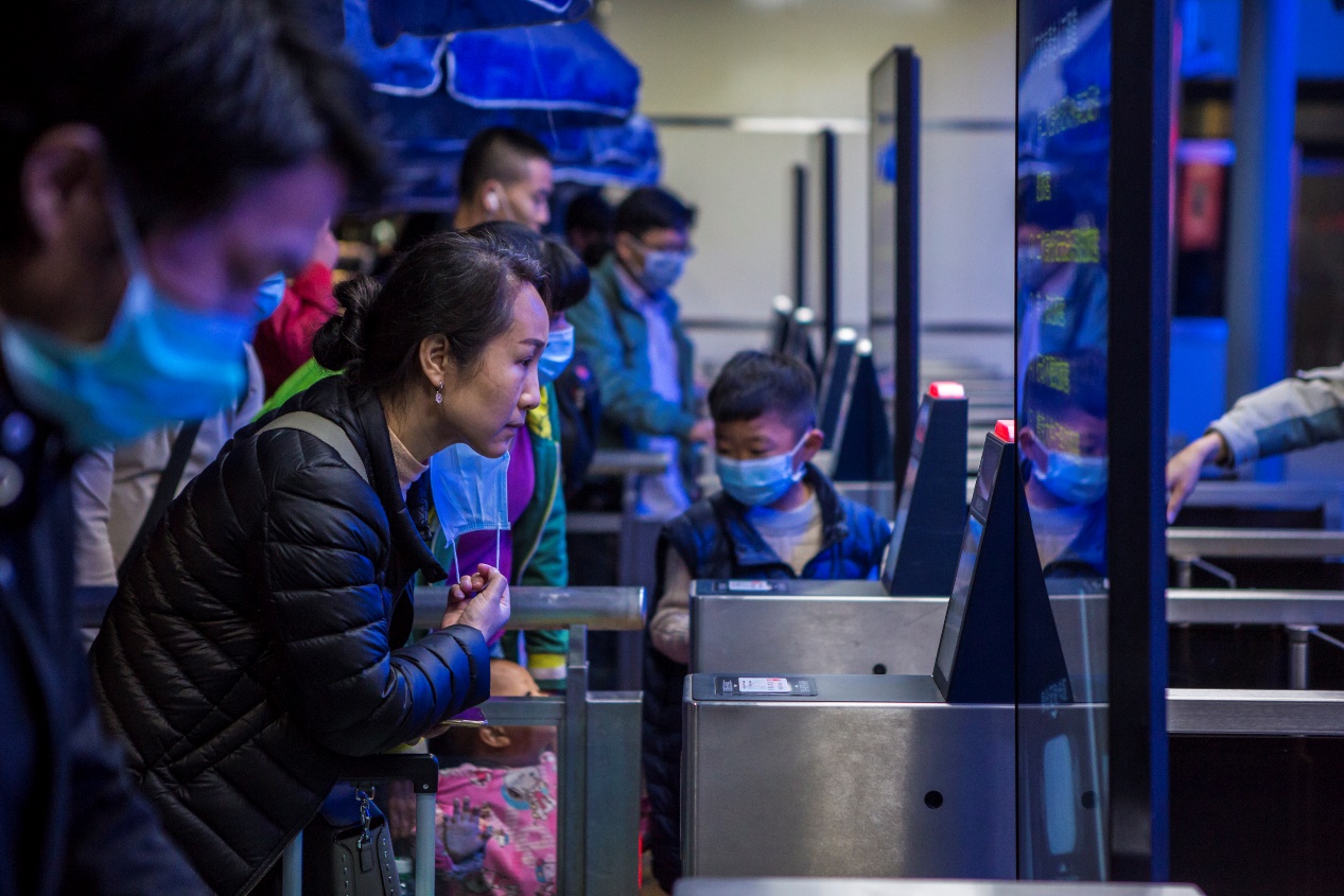 В 0 ч. 8 апреля в г. Ухань были сняты ограничения на выезд из города. Пассажиры готовятся выйти на платформу, пройдя через систему распознавания лиц на вокзале «Учан».