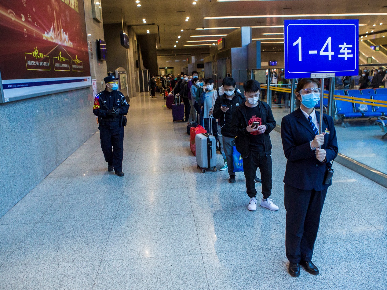 В 0 ч. 8 апреля в г. Ухань были сняты ограничения на выезд из города. Пассажиры на вокзале «Учан» готовятся выйти на платформу.