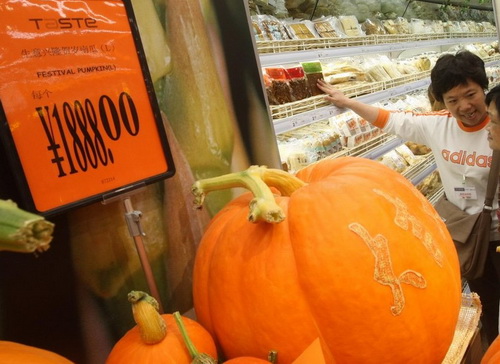 Обратите внимание на красавицы тыквы с изображением благопожеланий и различных символов благоденствия на их апельсинно-рыжих боках. Крупнейшая тыква весом почти 30 кг. стоит 1888 юаней. По словам сотрудника супермаркета, эти тыквы при постоянной температуре могут храниться несколько месяцев.