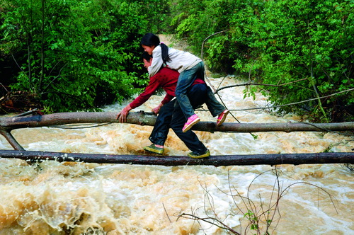 Летом в деревне Юшань часто идут дожди, и, бывает, с гор часто сходят селевые потоки, а дороги превращаются в реки. После занятий Чжао Пэн провожал каждого ученика, помогая ему перейти через реку. Точнее, он выбирал мелкое место и шел вброд, перенося малышей на спине. Там, где было все же глубоко, он натянул сплетенный из ивняка мост и, привязяв к себе ребенка, переходил с ним по этому самодельному мосту.