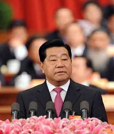 Председатель Всекитайского комитета Народного политического консультативного совета Китая /ВК НПКСК/ Цзя Цинлинь выступает с докладом о работе Бюро ВК НПКСК.